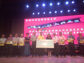 柔佛州老友联谊会筹得60万令吉给宽柔中学至达城分校,张北琛(右4起)在廖彩彤和郑金财见证下,移交模拟支票给童星存,左5为王志红。