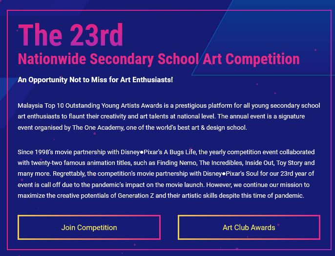 The One Academy 荣誉呈现大马最盛大的中学美术比赛, *马来西亚十大杰出美术青少年大赛2020*! 优胜者可 *赢取总值RM 600,000的奖学金和奖金总值RM 10,000*! 比赛已正式开放于所有就读中学的学生参加。今年也和我们一同继续启发年轻的一代! 为大马造就更多震撼国际美术界的创意青少年! 赶紧参与 *第一回合的比赛吧*!https://top10.toa.edu.my